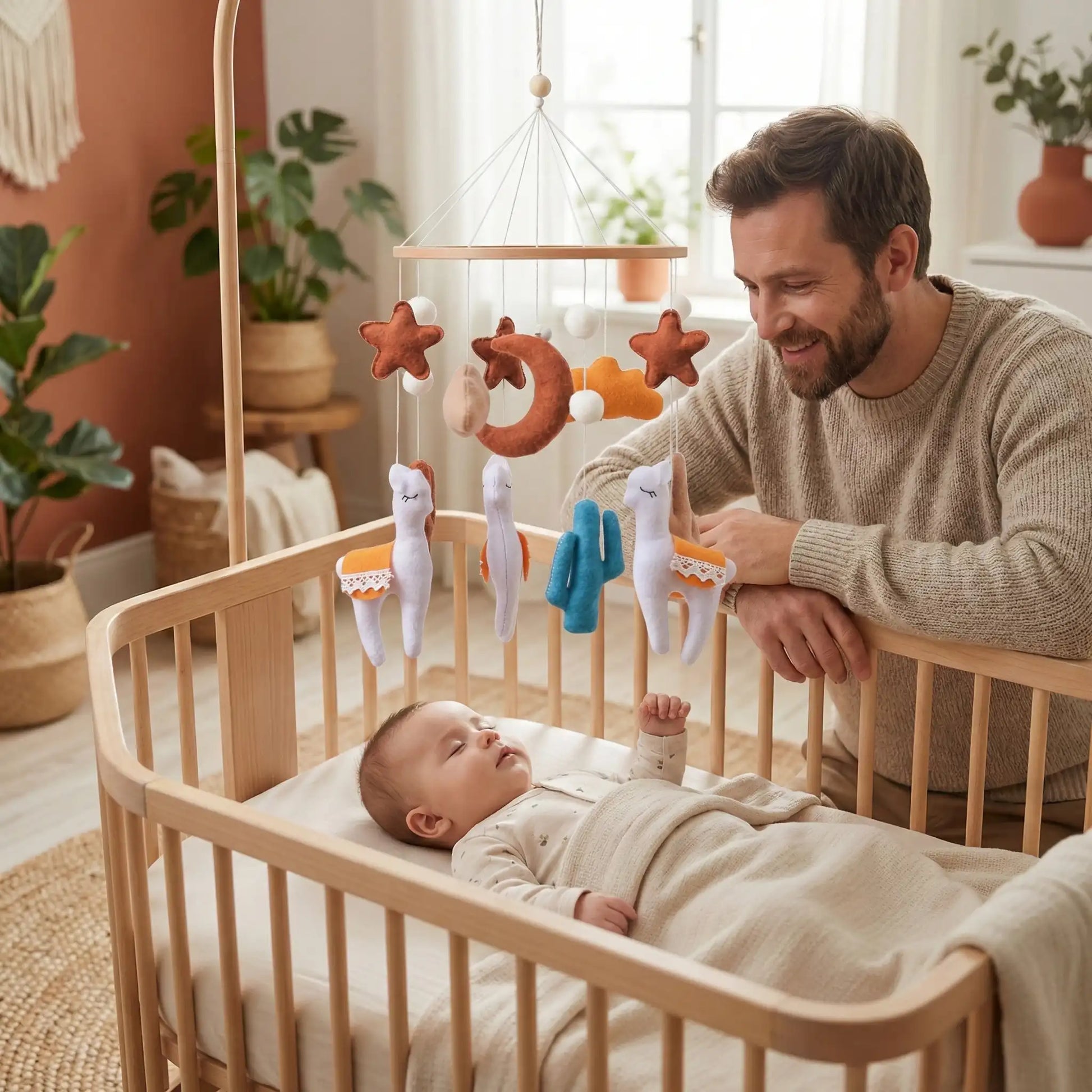 Chaque détail compte quand il s'agit de votre bébé. Ce mobile est entièrement cousu à la main avec un soin infini. La laine d'agneau enveloppe chaque forme comme un câlin. Le rembourrage en coton respire la douceur.
